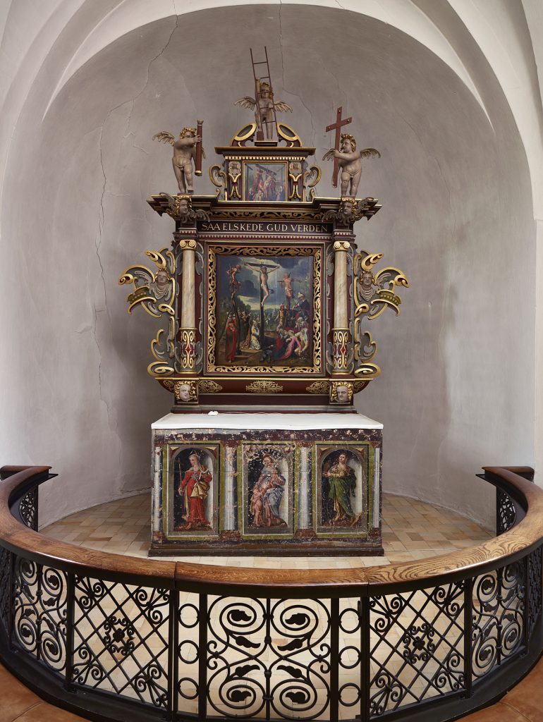 Forsidebilledet viser Dronninglund kirkes interiør og den store renæssancealtertavle med en kopi af Carl Blochs maleri af opstandelsen. Altertavlen er dækket af en hinde af grågult snavs og misfarvet fernis. En stor del af arbejdet består derfor af rensning og fjernelse af misfarvninger. Desuden vil de løse farveskaller blive fastlagt, og farvemæssige mangler vil blive retoucheret. For at beskytte overfladerne imod både lys og snavs vil de til sidst blive helt eller delvist ny-ferniserede. Det udskårne rammeværk behandles i kirken fra stillads, men maleriet skal nedtages og transporteres til behandling på konserveringsværksted.
